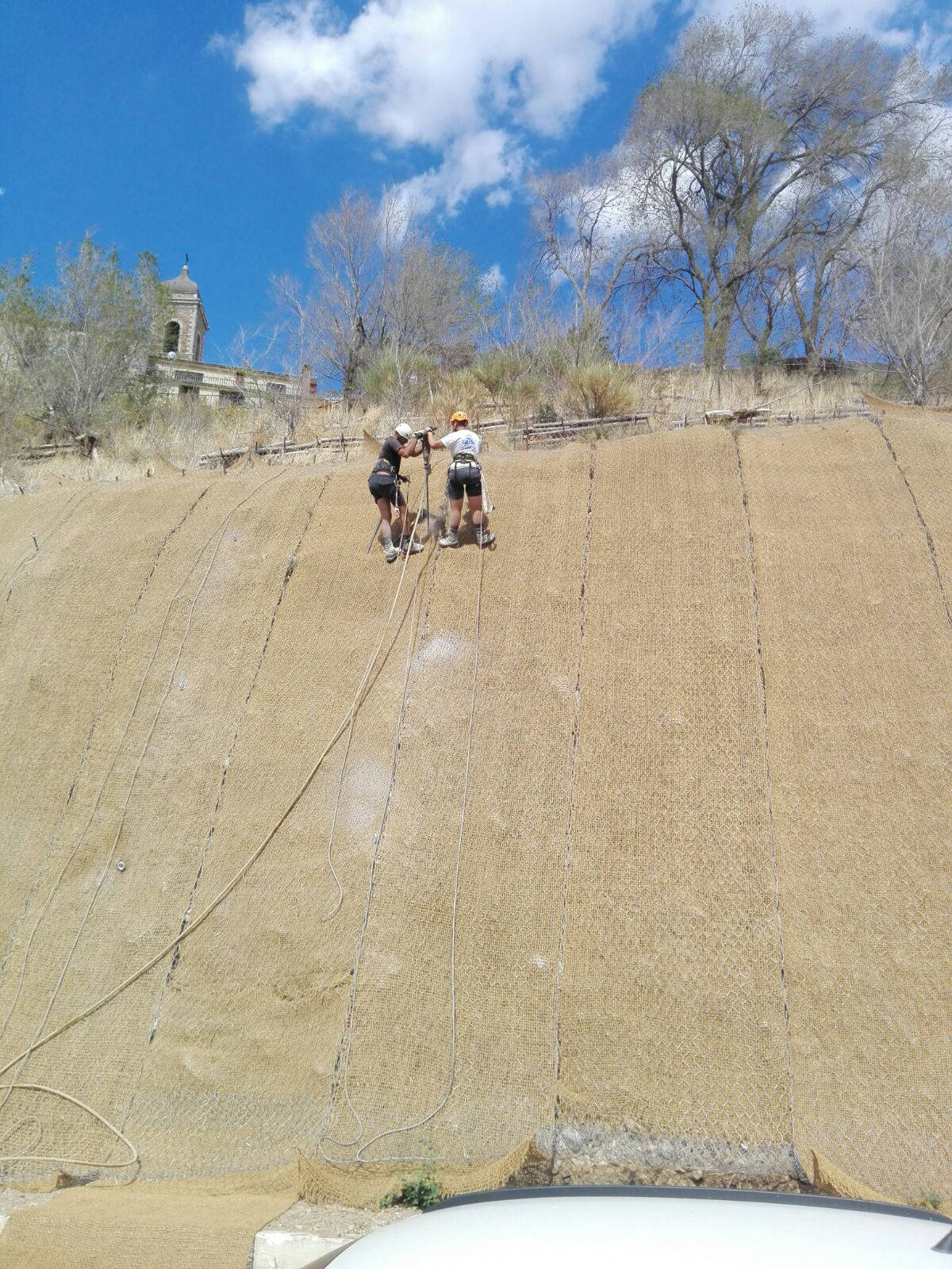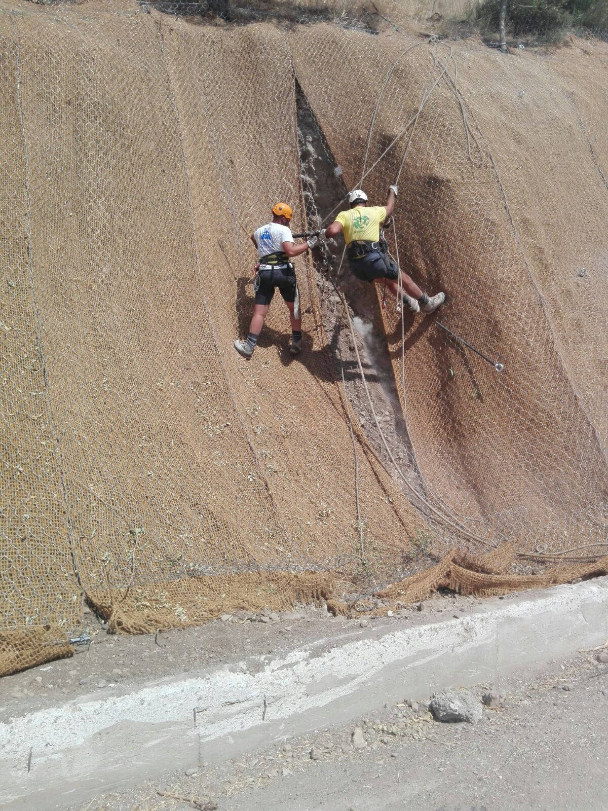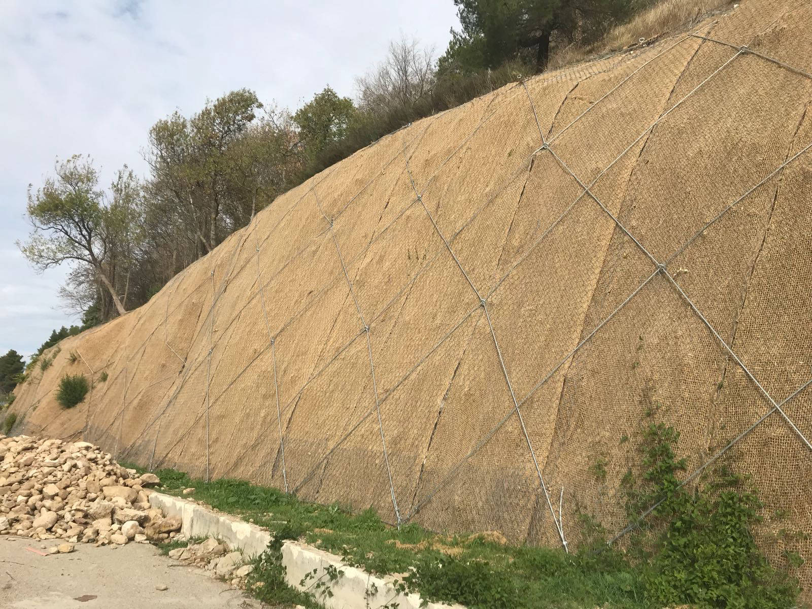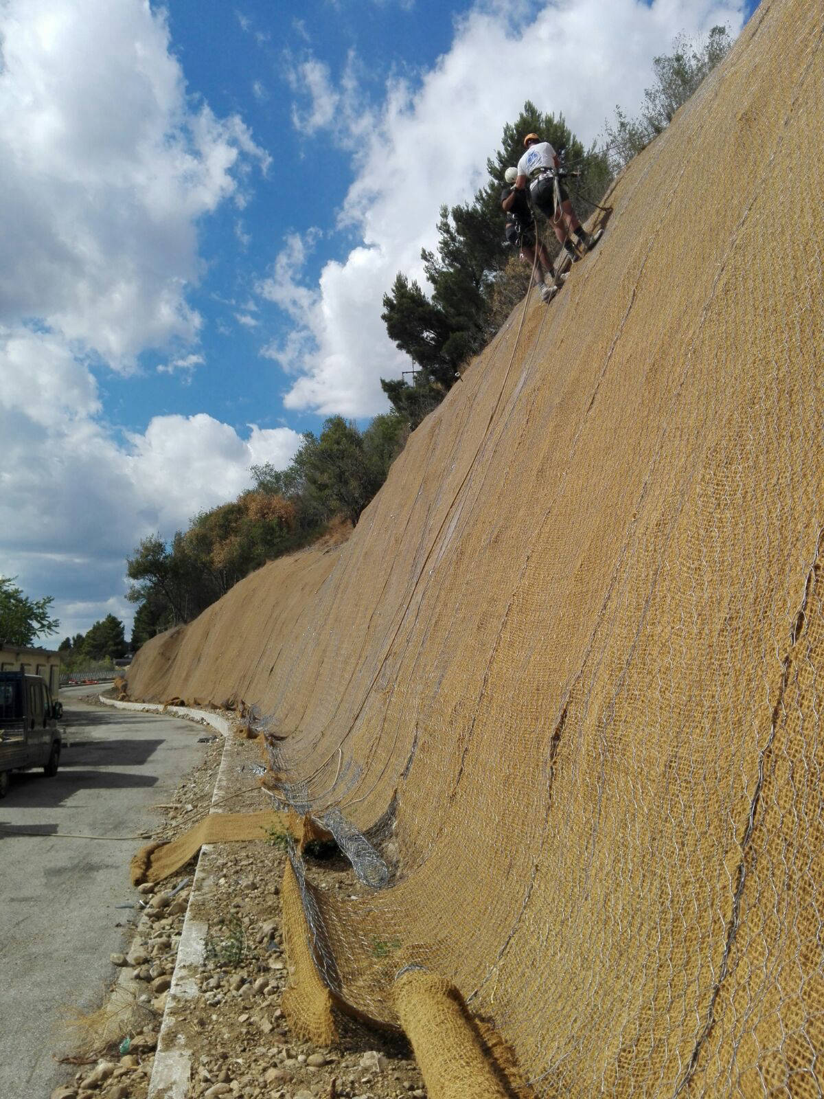 La scelta progettuale è stata quella di posizionare prima la biorete fissata in sommità, poi srotolarla morbidamente in modo che potesse aderire perfettamente al substrato proteggendolo dal dilavamento superficiale e solo per ultimo è stata posizionata e fissata la rete metallica rafforzata da un reticolo di fune metallica.